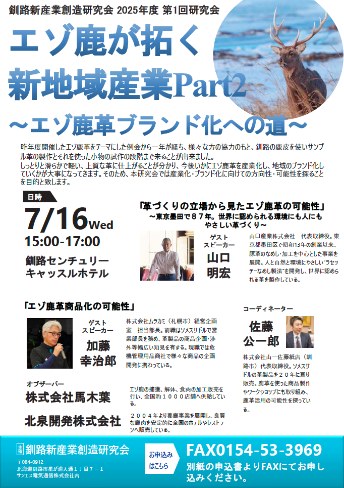 エゾ鹿が拓く新地域産業 Part2 2025.07.16 昨年度の検討から一年、実際のサンプル製作を経て、より具体的な産業化の方向性を探る研究会を開催しました 。 北海道新聞にて「エゾシカ革製品に」が紹介されました 前の記事 北海道新聞にて「釧路の地域ブランド化」への挑戦が紹介されました 次の記事